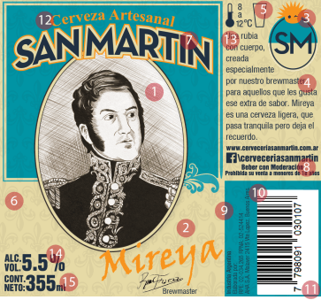1. Se simuló la ilustración basada en el cuadro más representativo de San Martin que lo presenta como padre de la patria, envuelto en la bandera argentina, esta esta connotada por el uso de los colores para la etiqueta. Esta elección responde a una tendencia de vuelta a los orígenes a nivel mundial, evidenciada también en el rediseño del logo de Bacardí, para volver al grabado del murciélago original que tenían a principios del siglo pasado[i]. Como la cervecería comenzó sus actividades en 2013, no tenía sentido indicar fecha de establecimiento, sólo quedaba trabajar desde lo visual para connotar una relación con lo tradicional.